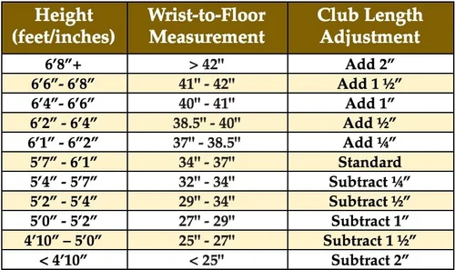 Ht WTF Initial Lie Length 7i Length 410 285 -3 -2 35 411 285 -3 -2 35 50 285 -3 -15 355 51 285 -3 -15 355 52 285 -3 -1 36 53 285 -3 -1 36 54 285 -4 -05 365 55 285 -4 -05 365. If your height and wrist-to-floor measurement are in the Standard range you have standard golf club length. Height based chart technique is arguably the best method that fitters use to adjust golf club length.